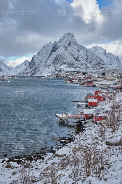 Рейнская рыбацкая деревня на Лофотенских островах с красными домами руербу зимой со снегом. Норвегия