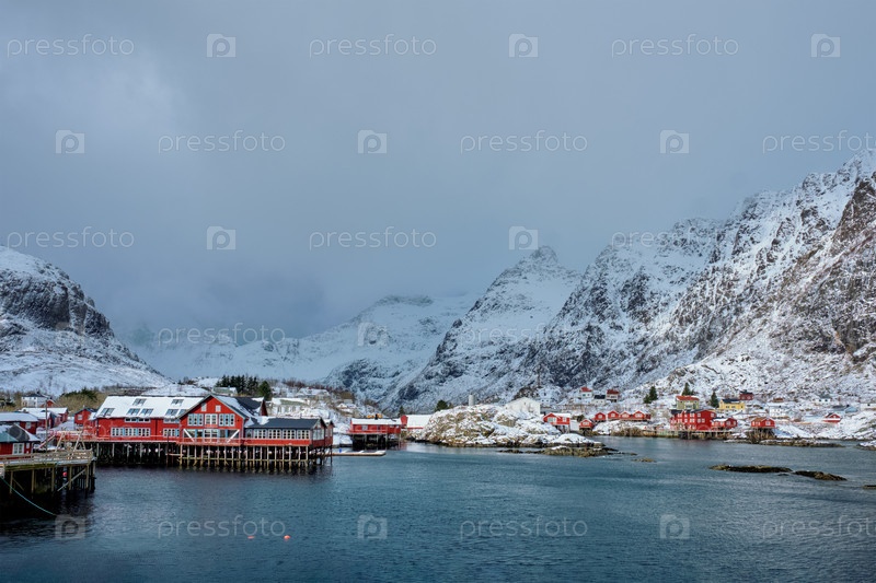 Традиционная рыбацкая деревня А на Лофотенских островах, Норвегия с домами из красного руербу