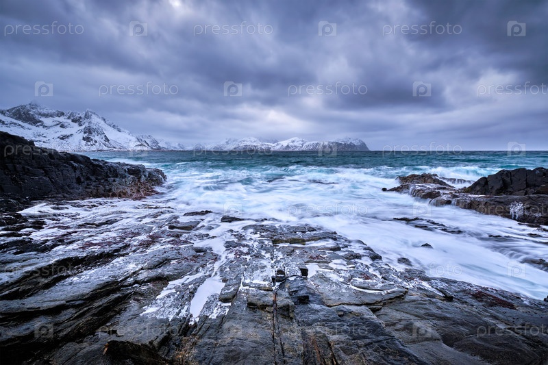 Волны Норвежского моря раздавливаются на скалистом побережье в фьорде