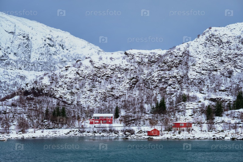 Традиционные дома красного руербу на берегах фьорда зимой в снегу.Острова Лофотен, Норвегия