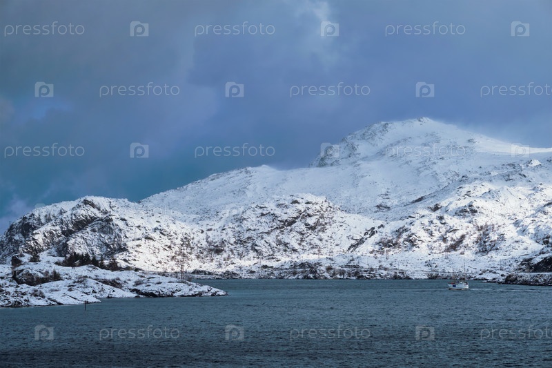 Рыболовная лодка в норвежском фьорде.Острова Лофотен, Норвегия