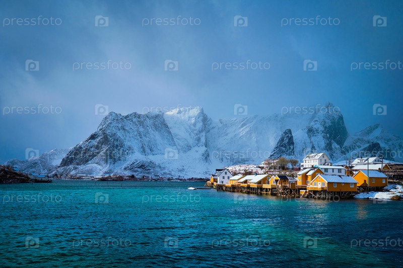 Желтый дом руербу рыбацкая деревня Сакриса со снегом зимой Острова Лофотен, Норвегия