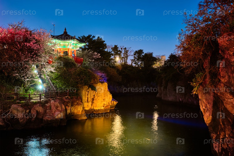 живописный пруд Йонгён с павильоном Юен, освещенным ночью, острова Чеджу, Южная Корея