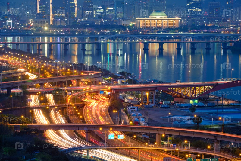 Городской пейзаж Сеула на закате, Южная Корея