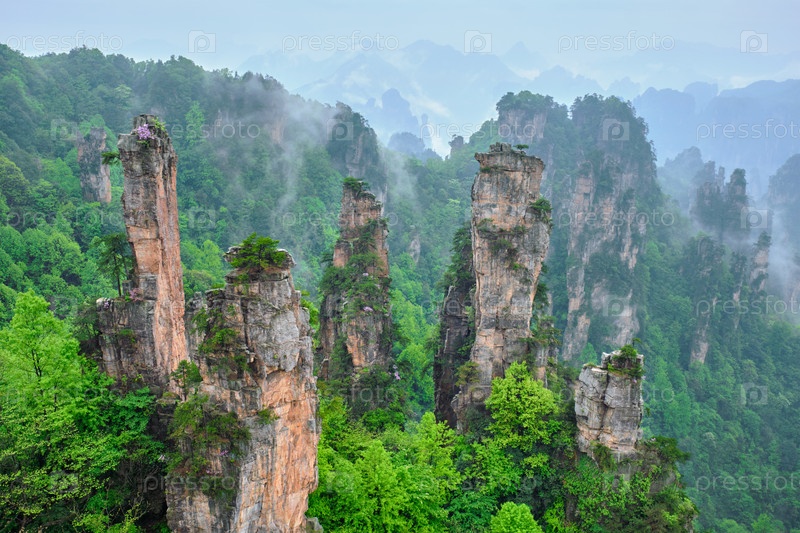 Известная туристическая достопримечательность Китая - каменные столбы скальных гор Чжанцзянджи в туманных облаках во Вулингюане, провинция Хунань, Китай