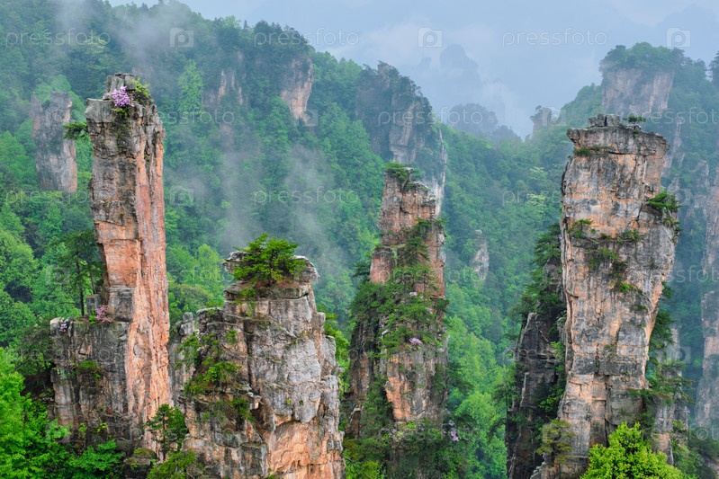 Известная туристическая достопримечательность Китая - каменные столбы скальных гор Чжанцзянджи в туманных облаках во Вулингюане, провинция Хунань, Китай
