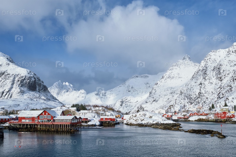 Традиционная рыбацкая деревня А на Лофотенских островах, Норвегия с домами из красного руербу