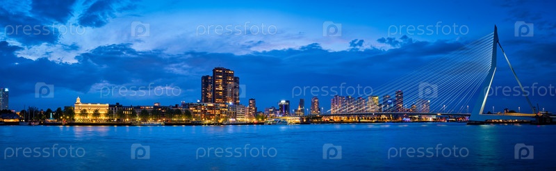 Вид на Эразмусбруг и горизонт Роттердама освещен ночью.Роттердам, Нидерланды