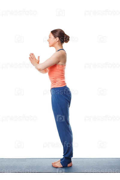 Женщина практикует асану йоги tadasana namaste - горная поза с приветствием, изолированной на белом фоне