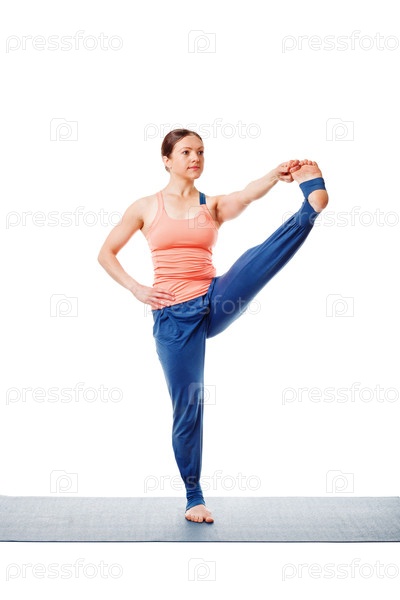 Женщина, выполняющая асану Аштанга Виньяса йога Утхита до padangustasana С - позу 'рука на ногу' C изолированная на белом фоне
