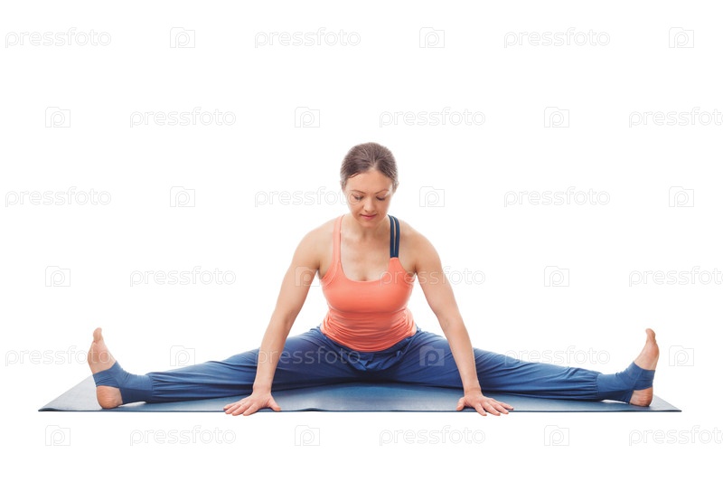 Женщина делает астангу Аштанга Виньяса Йога, асану Упависта Конасан - широкоугольная сидящая передняя изгибающаяся поза изолирована на белом