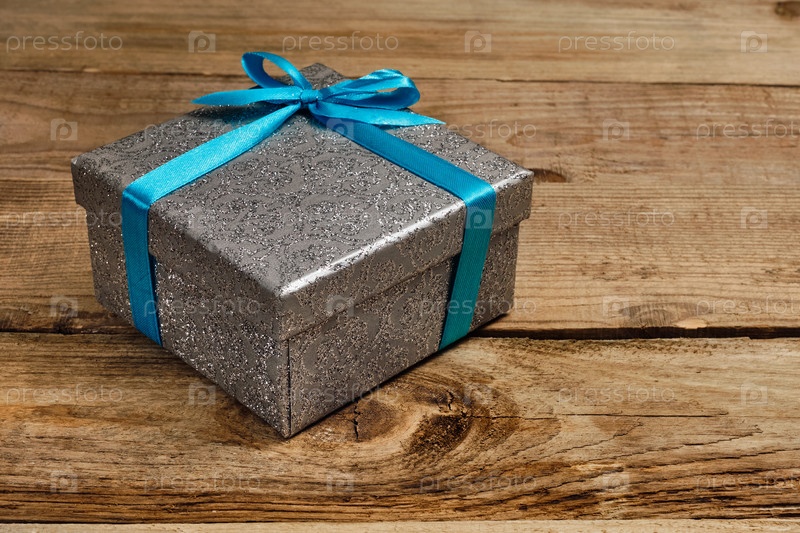 Концепция новогоднего подарка на день рождения - серебряный подарочный ящик с синей лентой на старом деревянном фоне