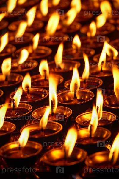 Горящие свечи в буддийском храме.Дхарамсала, Химачал-Прадеш, Индия