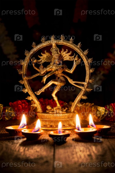Concept Maha Shivaratri or Diwali - статуэтка Шивы Натаражи с огнями дивали и масляными свечами, Индия