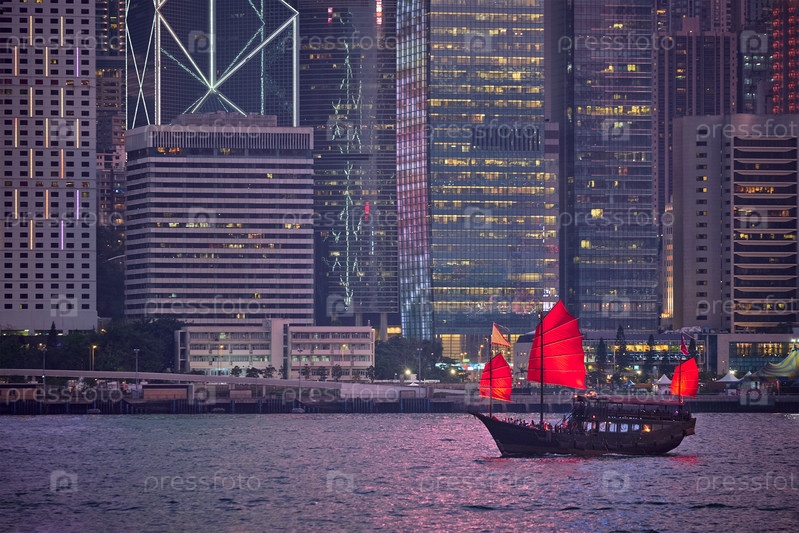 Туристический мусорный паром с красными парусами и небоскребами горизонта Гонконга в центре города над гаванью Виктория вечером