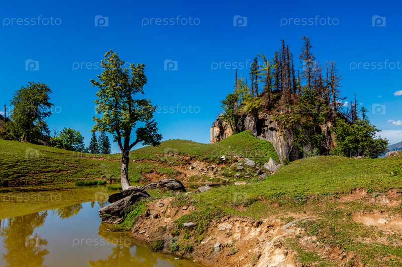 Живописные индийские гималайские пейзажи в Гималаях с деревом и небольшим озером