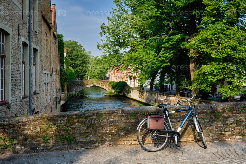 Типичный бельгийский живописный городской пейзаж Европы представляет собой концепцию туристского и велосипедного транспорта - велосипед на мосту возле канала и старый дом