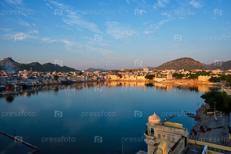 Вид на знаменитый индийский городок индуистского паломничества - священный религиозный город Пушкара среди холмов с храмом Брахма-Мандир, озером и традиционными пушкирскими горами при закате