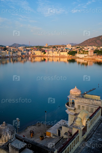 Вид на знаменитый индийский городок индуистского паломничества - священный религиозный город Пушкара среди холмов с храмом Брахма-Мандир, озером и традиционными пушкирскими горами при закате