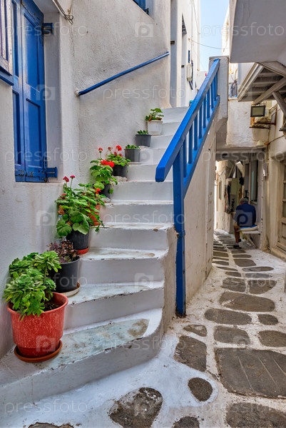 Живописные живописные узкие греческие улицы с традиционными белыми домами с голубыми окнами дверей города Миконос в знаменитой туристической достопримечательности острова Миконос, Греция