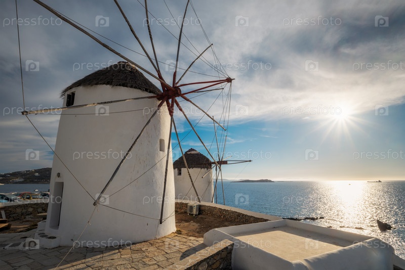 Традиционные греческие ветряные мельницы на острове Миконос на рассвете, Киклады, Греция