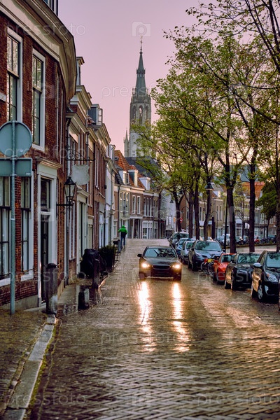 Делфтская мощенная улица с автомобилем под дождем и башней церкви Nieuwe Kerk на заднем плане