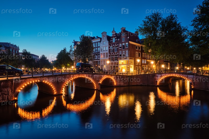 Ночной вид на городской пейзаж Амстердама с каналом, мостом и средневековыми домами освещается в вечернее сумерки
