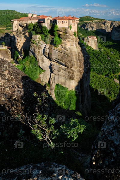 Монастырь Варлаам и Русану в знаменитой греческой туристической точке Метеора в Греции при закате солнца с живописным пейзажем