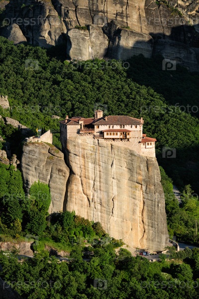 Монастырь Русану, расположенный на скале в знаменитом греческом туристическом месте Метеора в Греции при закате солнца с живописным пейзажем