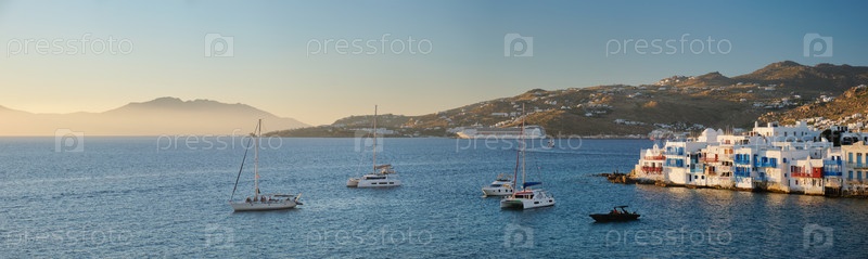 Закат на острове Миконос, Греция с яхтами в гавани и красочными домами на набережной Маленькой Венеции - это романтическое место при закате солнца и круизный корабль