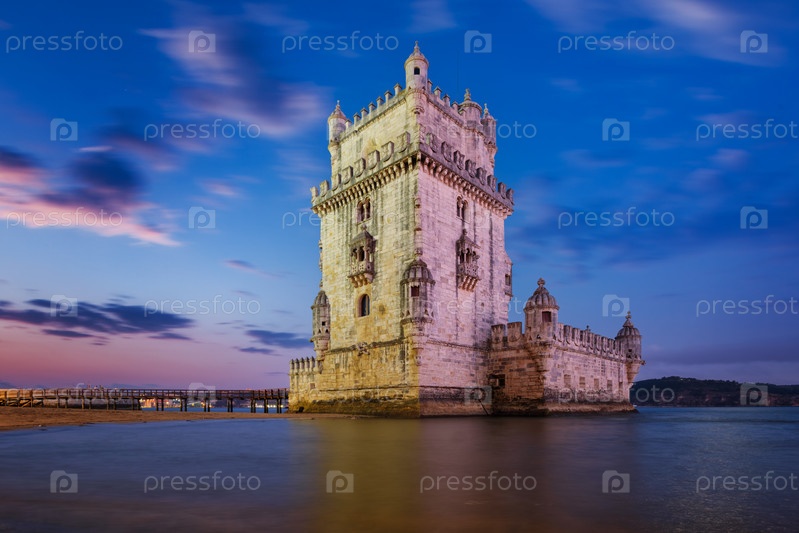 Башня Белема или башня Святого Винсента - известная туристическая достопримечательность в Лиссабоне и туристическое направление - на берегу реки Таго (Тежо) после захода солнца при закате с драматическим небом