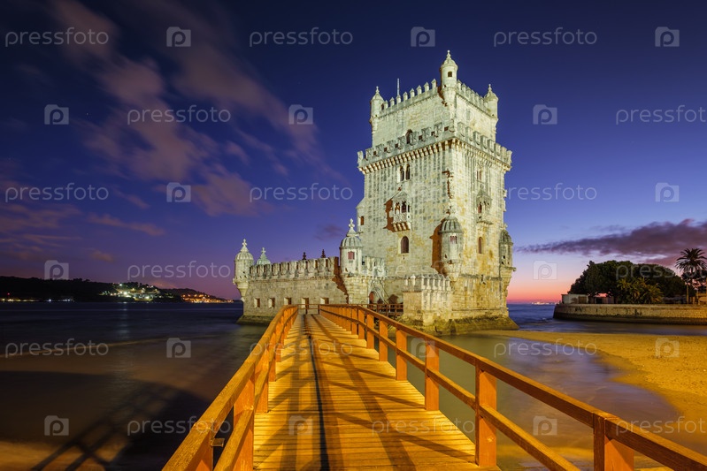 Башня Белема или башня Святого Винсента - известная туристическая достопримечательность в Лиссабоне и туристическое направление - на берегу реки Таго (Тежо) после захода солнца при закате с драматическим небом