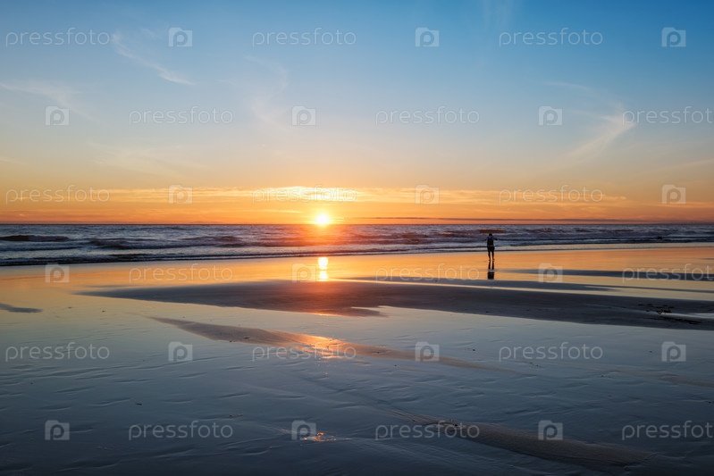 Закат Атлантического океана с силуэтом фотографа, фотографирующего штормовые волны на пляже Фонте-да-Теля, Коста да Капарика, Португалия