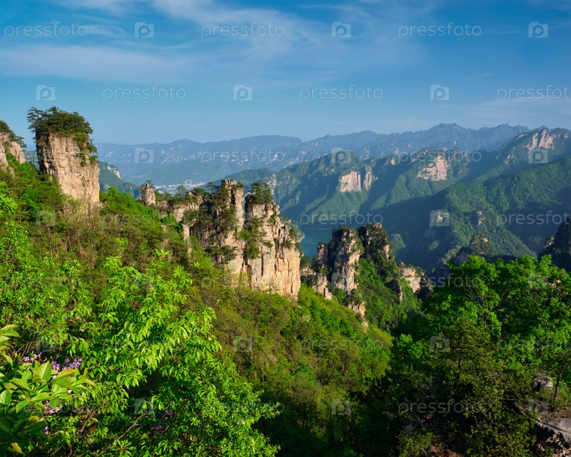Известная туристическая достопримечательность Китая - каменные столбы скальных гор Чжанцзянджи при закате солнца в Улингюане, провинция Хунань, Китай