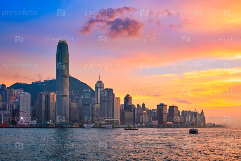 Горизонт Гонконга небоскребы в центре города над гаванью Виктория вечером с мусорным туристическим паромом на закате с драматичным небом