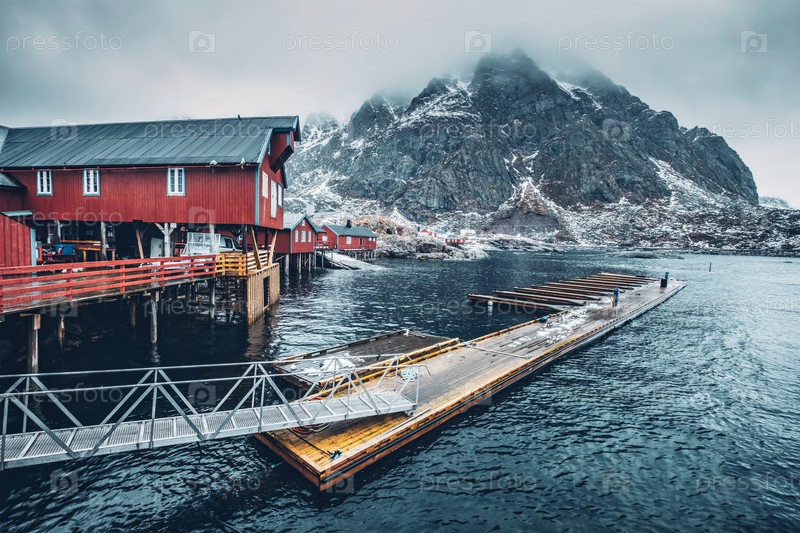Традиционная рыбацкая деревня A i Lofoten.Острова Лофотен, Норвегия с домами из красного руербу.Снег зимой
