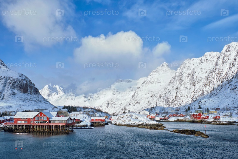 Традиционная рыбацкая деревня А на Лофотенских островах, Норвегия с домами из красного руербу