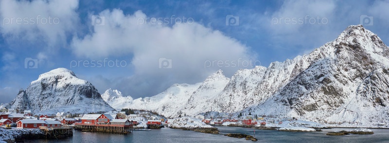 Панорама традиционной рыбацкой деревни А на Лофотенских островах, Норвегия с домами из красного руербу