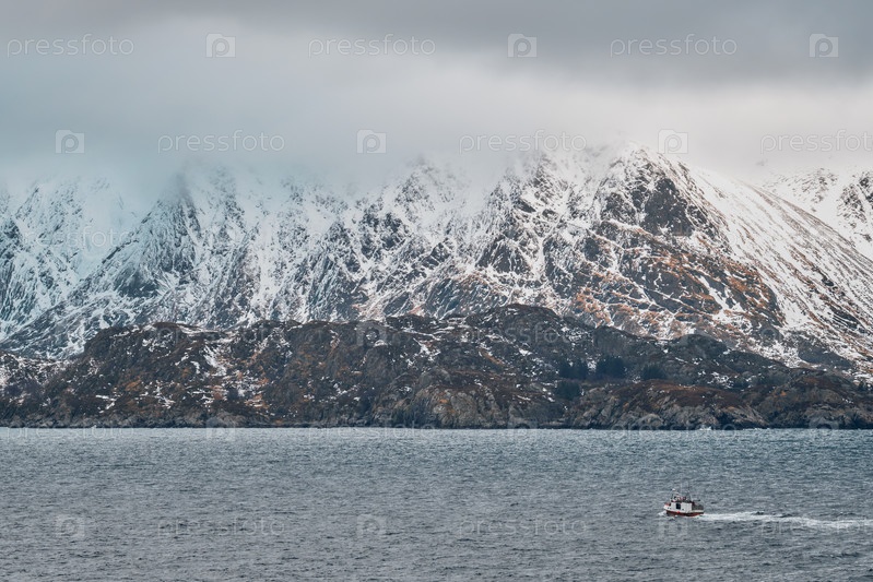 Рыболовная лодка в норвежском фьорде.Острова Лофотен, Норвегия