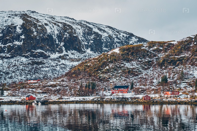 Традиционные дома красного руербу на берегах фьорда зимой в снегу.Острова Лофотен, Норвегия