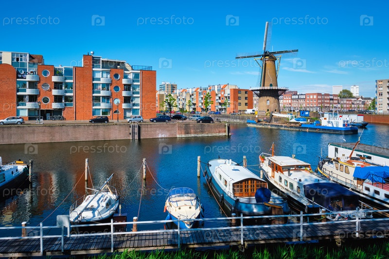 Вид на гавань Делфшафена и старую зерновую мельницу De Destillerketel.Роттердам, Нидерланды