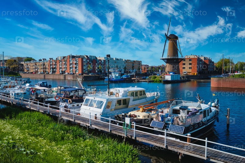 Вид на гавань Делфшафена и старую зерновую мельницу De Destillerketel.Роттердам, Нидерланды