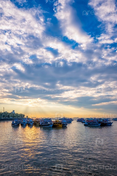 Туристические лодки в море на рассвете в Мумбаи, Индия
