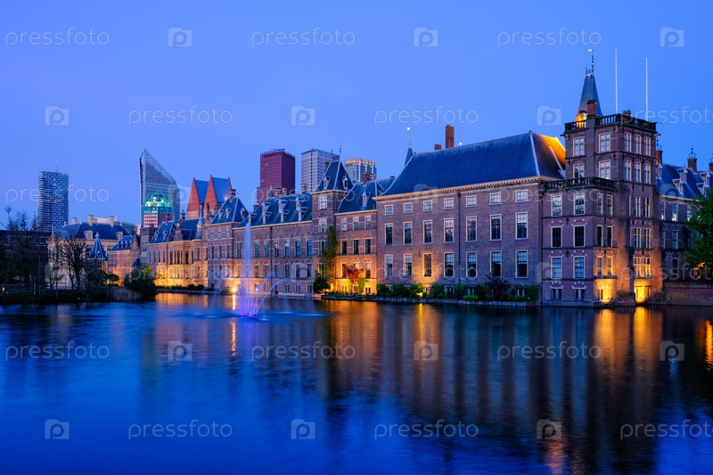 Вид на здание парламента Binnenhof и озеро Hofwijver с небоскребами в центре города освещается вечером