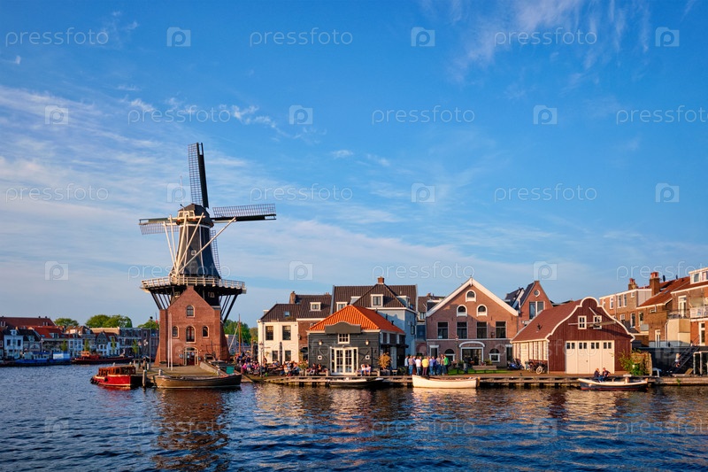 Гарлемский городской пейзаж - это знаковая ветряная мельница De Adriaan на реке Spaarn с лодками