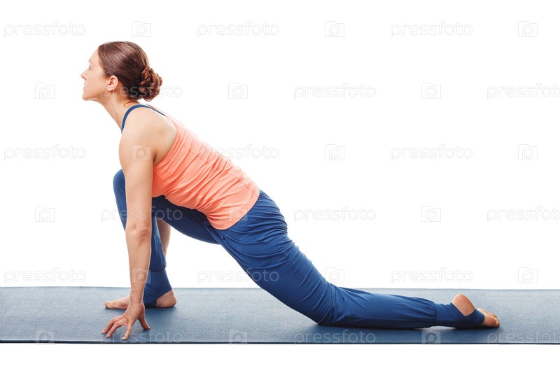 Женщина, практикующая асану йоги anjaneasana - поза низкого полумесяца в Surya Namaskare Greeting the Sun изолирована на белом фоне