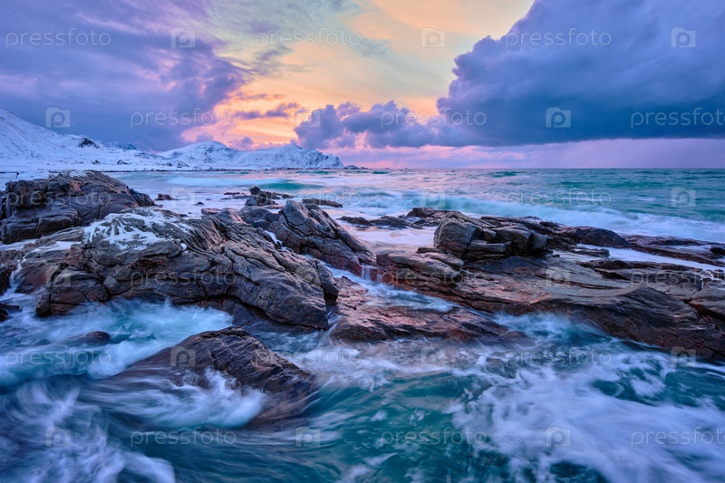Норвежские морские волны на скалистом побережье Лофотенских островов, Норвегия