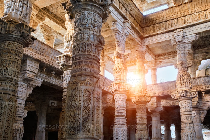 Колонны колонн красивого джайнинского храма Ранакпур или Чатурмукха Дхарана Вихра. Мраморная древняя средневековая резьба с изображением священного места поклонения джайнизму