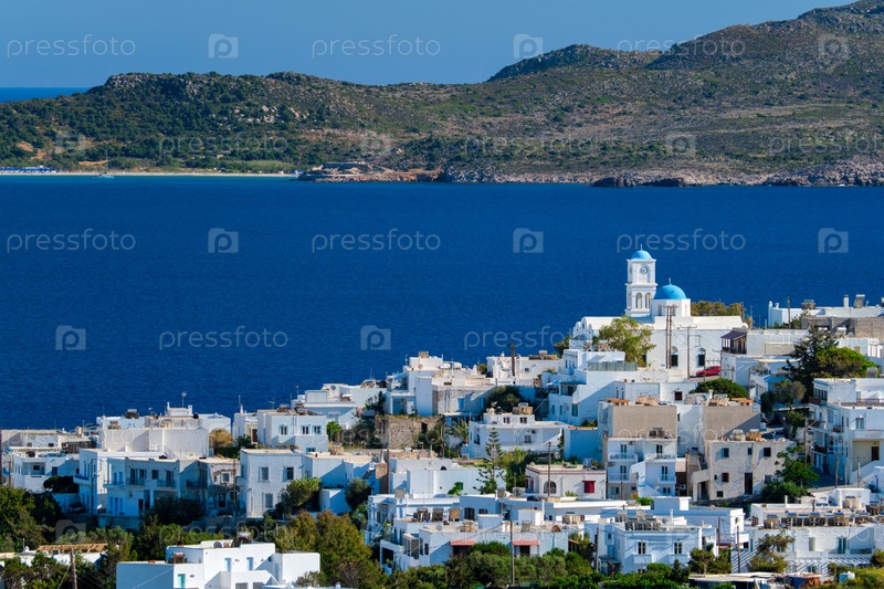 Вид на деревню Плака с традиционной греческой церковью.Остров Милос, Греция
