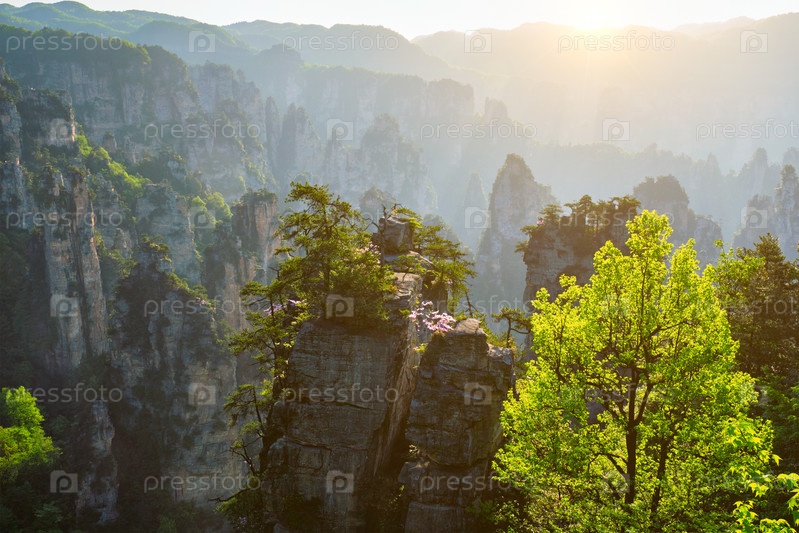 Известная туристическая достопримечательность Китая - каменные столбы скальных гор Чжанцзянджи при закате солнца в Улингюане, провинция Хунань, Китай